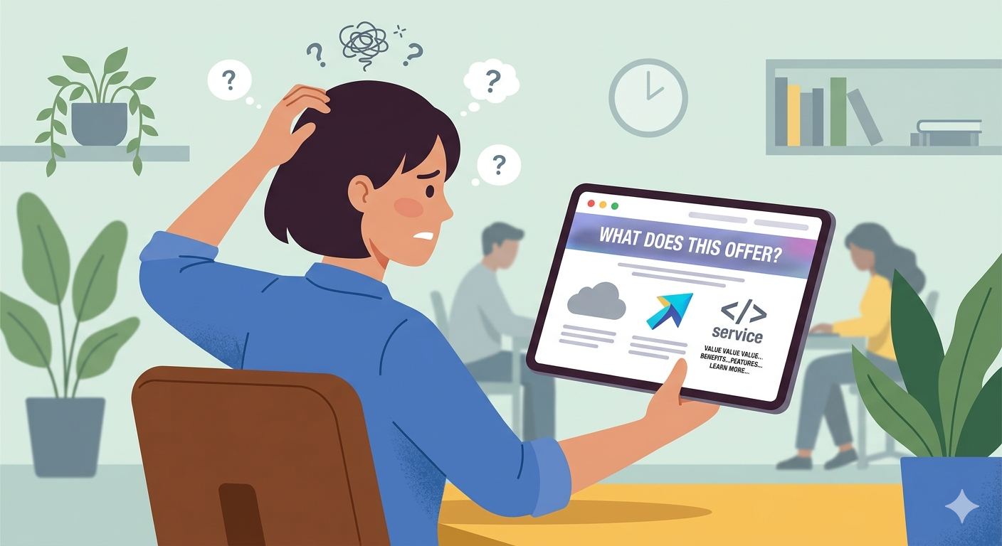 作る側は自社サービスを理解しているから、説明を省略してしまうのです。しかしユーザーは最初の3秒で**「このページは自分に関係あるか」**を判断します。訪問者の55%は15秒以内にページを去ります。