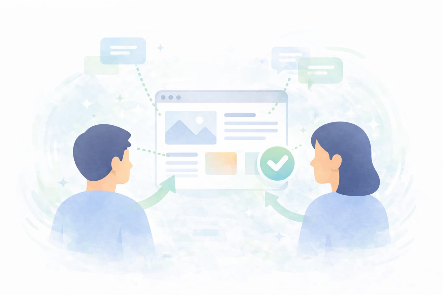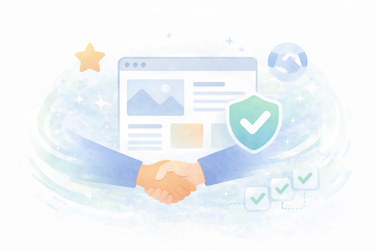 ❌ **NG:**抽象的なビジネスイメージ(握手、オフィス風景など)
