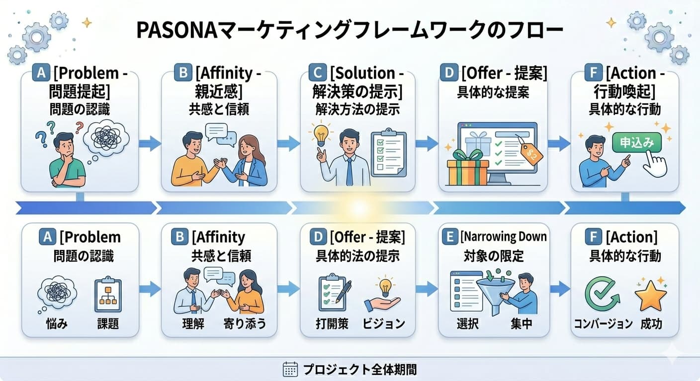 PASONAの法則を基本テンプレートとして、問題提起から行動喚起まで段階的にユーザーを導く