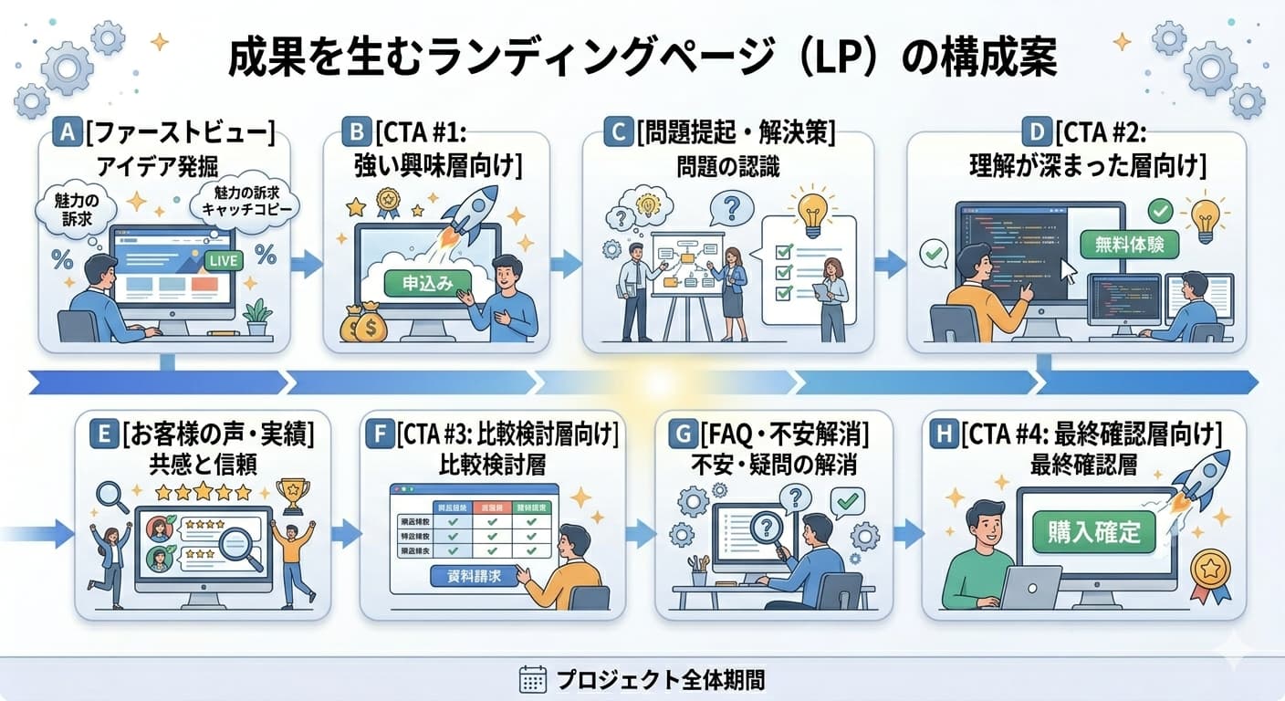成果が出るLPの構成とは、ユーザー心理に基づいて情報を最適な順序で提示し、迷いなくコンバージョンに導く設計のことです。